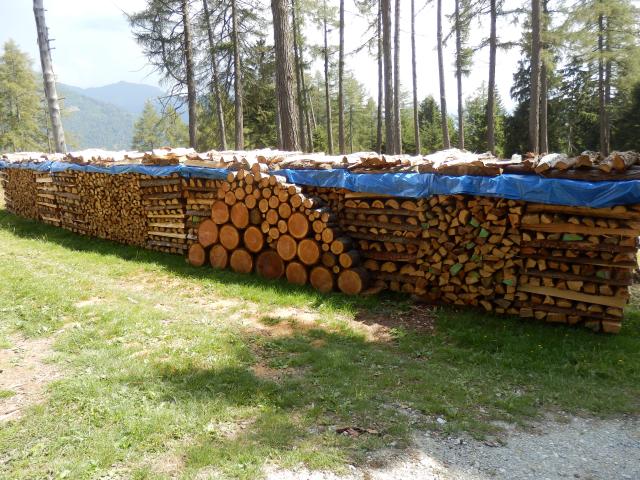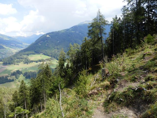 Der Bus bringt uns mit einem Umstieg in Fulpnes nach Mieders zur Serlesbahn. Wegen der Gäste-Card des Hotels sind Bus und Seilbahn umsonst. Tolle Sache. Nach dem Ausstieg aus der Seilbahn führt uns der Weg Richtung Maria Waldrast, der höchstgelegenen Wallfahrtskirche. Danach folgen wir dem langgezogenen Abstieg über den Trinsersteig, ein leichtes Auf und Ab über einen schmalen Waldweg, teilweise klettrig über Wurzeln und Stämme, aber leicht zu finden und als Waldwanderweg sehr schön. Die letzten vier Kilometer führen auf einem geraden Forstweg entlang bis wir oberhalb von Trins ankommen.