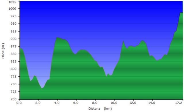 bewegen uns in einer Höhe zwischen 730m und 990m mit einem Gesamtanstieg von etwa 610m.