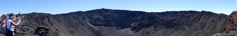 Beim Abstieg wollen wir uns wieder zur offiziellen Route orientieren, um zum eigentlichen Aussichtspunkt der Tour zu kommen. Jetzt wird auch deutlich, weshalb dieses Gelände für Wanderungen eigentlich viel zu riskant ist: viele Risse durchziehen den Boden und es könnte zu Abbrüchen kommen. Zum Glück heute nicht. Etwas nach der Hälfte der offiziellen Route treffen wir wieder auf den Weg und reihen uns ein. Der Weg zieht sich. Im wesentlichen geht es leicht aufwärts, aber in stetigem Auf und Ab durch kleinere Senken. Wir merken mittlerweile die Auswirkung der für uns ungewohnten Höhenluft auf über 2000 m. Die Anstiege werden anstrengender. Trotzdem ist das, was wir am Aussichtspunkt sehen das allemal wert: ein riesiger beeindruckender Krater, gegenüber der Gipfel des Cratère Bory mit dem jetzt winzig wirkenden Abbruch. Trotz vieler Menschen gibt es noch einen Platz für ein Picknick.