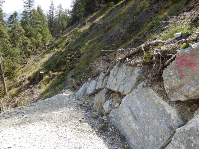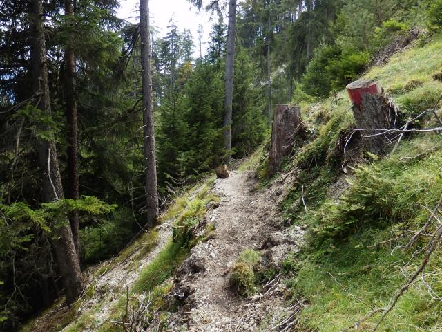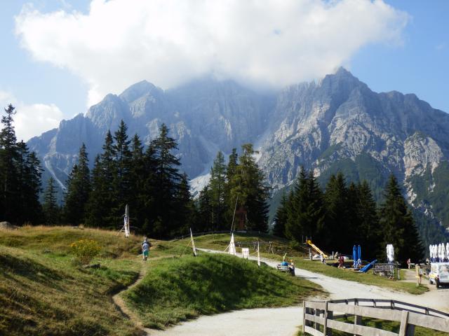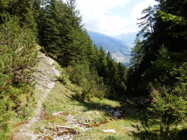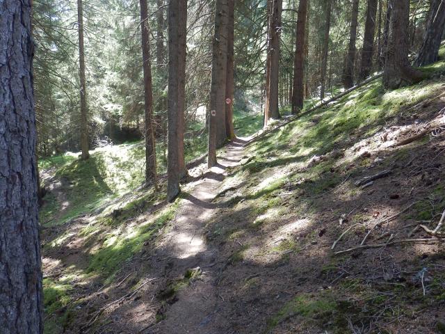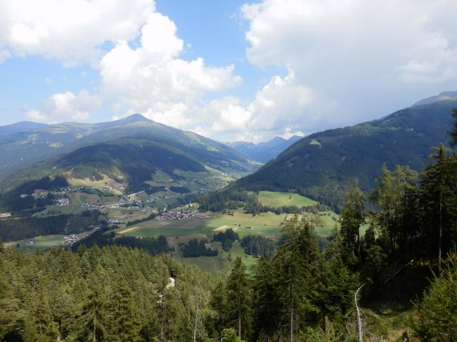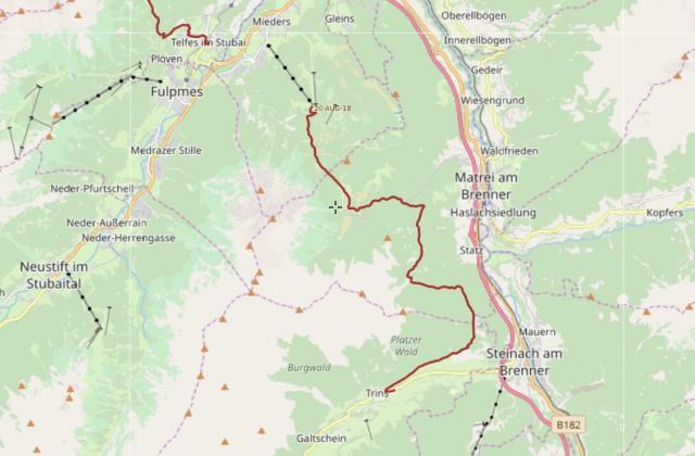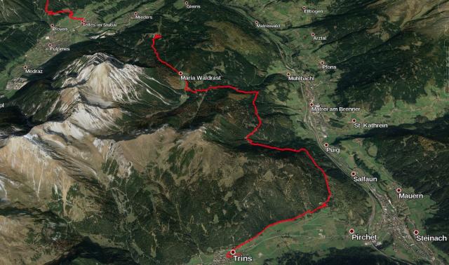 Der Bus bringt uns mit einem Umstieg in Fulpnes nach Mieders zur Serlesbahn. Wegen der Gäste-Card des Hotels sind Bus und Seilbahn umsonst. Tolle Sache. Nach dem Ausstieg aus der Seilbahn führt uns der Weg Richtung Maria Waldrast, der höchstgelegenen Wallfahrtskirche. Danach folgen wir dem langgezogenen Abstieg über den Trinsersteig, ein leichtes Auf und Ab über einen schmalen Waldweg, teilweise klettrig über Wurzeln und Stämme, aber leicht zu finden und als Waldwanderweg sehr schön. Die letzten vier Kilometer führen auf einem geraden Forstweg entlang bis wir oberhalb von Trins ankommen.