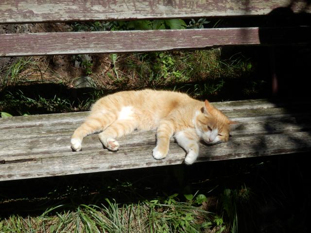 Wahrscheinlich haben wir nur auf ihrem Platz gesessen, denn sie bleibt auf der Bank in der Sonne liegen.