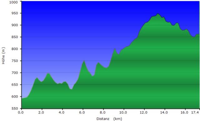 Es ist Dienstag und vor uns liegt eine Strecke von knapp 16,5 km in einer Höhe von 600-900 m.