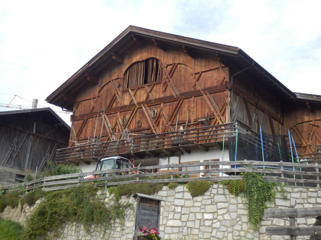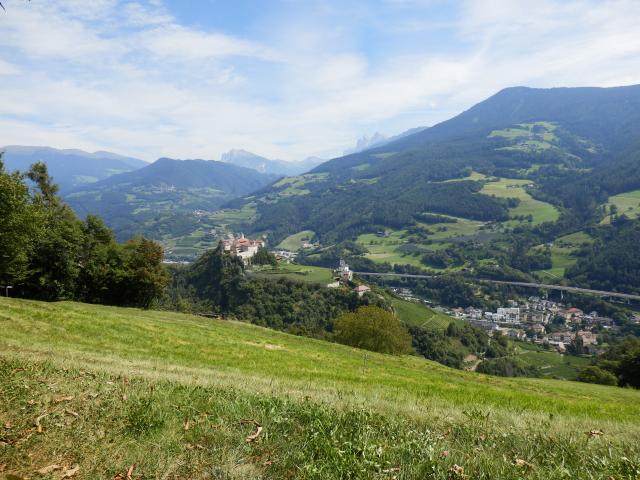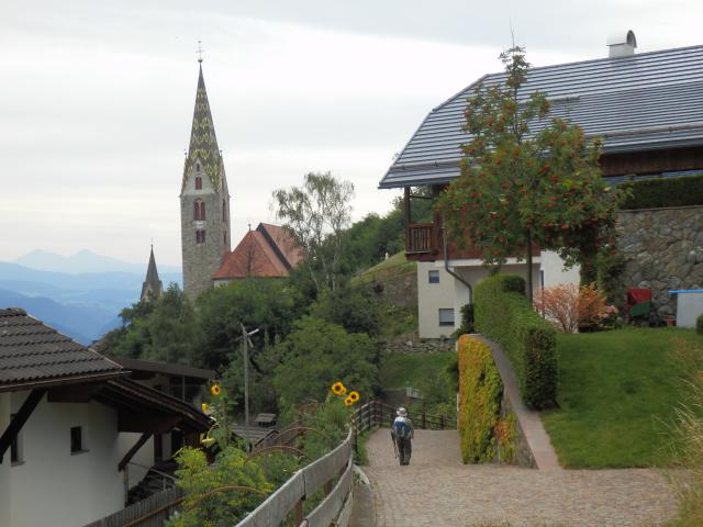 Sonne. Oben angekommen geht es in sanftem Auf und Ab vorbei an Wiesen und Häusern nach Villanders. Beim Rückblick ist noch