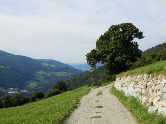 der durch Wald und vorbei an Wiesen, Häusern und Höfen führt. Links von uns ist das Eisachtal mit der Brennerautobahn,