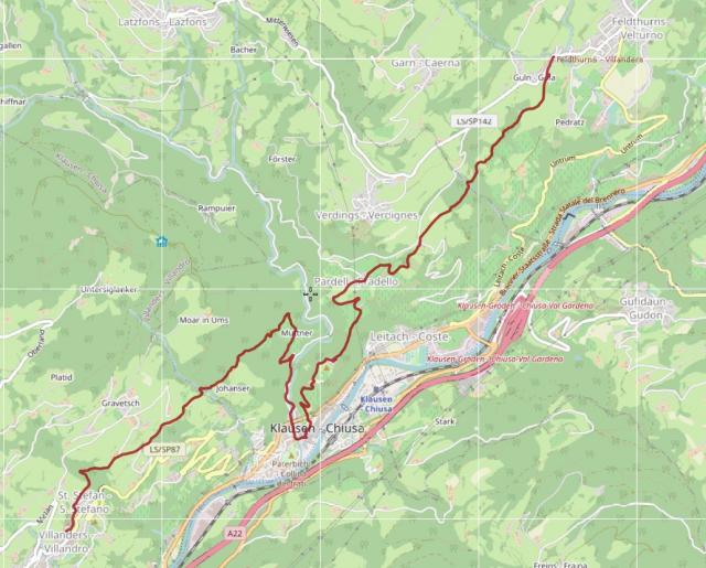 Die Wanderung startet vor dem Hotel in Feldthurns, führt über das Kloster Säben und durch Klausen und endet an