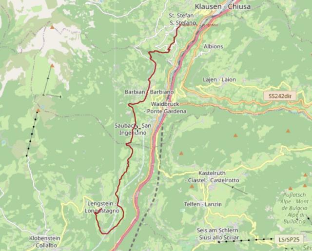 Die Wanderung startet vor dem Hotel in Villanders, führt über Barbian und Ritten bis zur Bushaltestelle in Lengstein, da